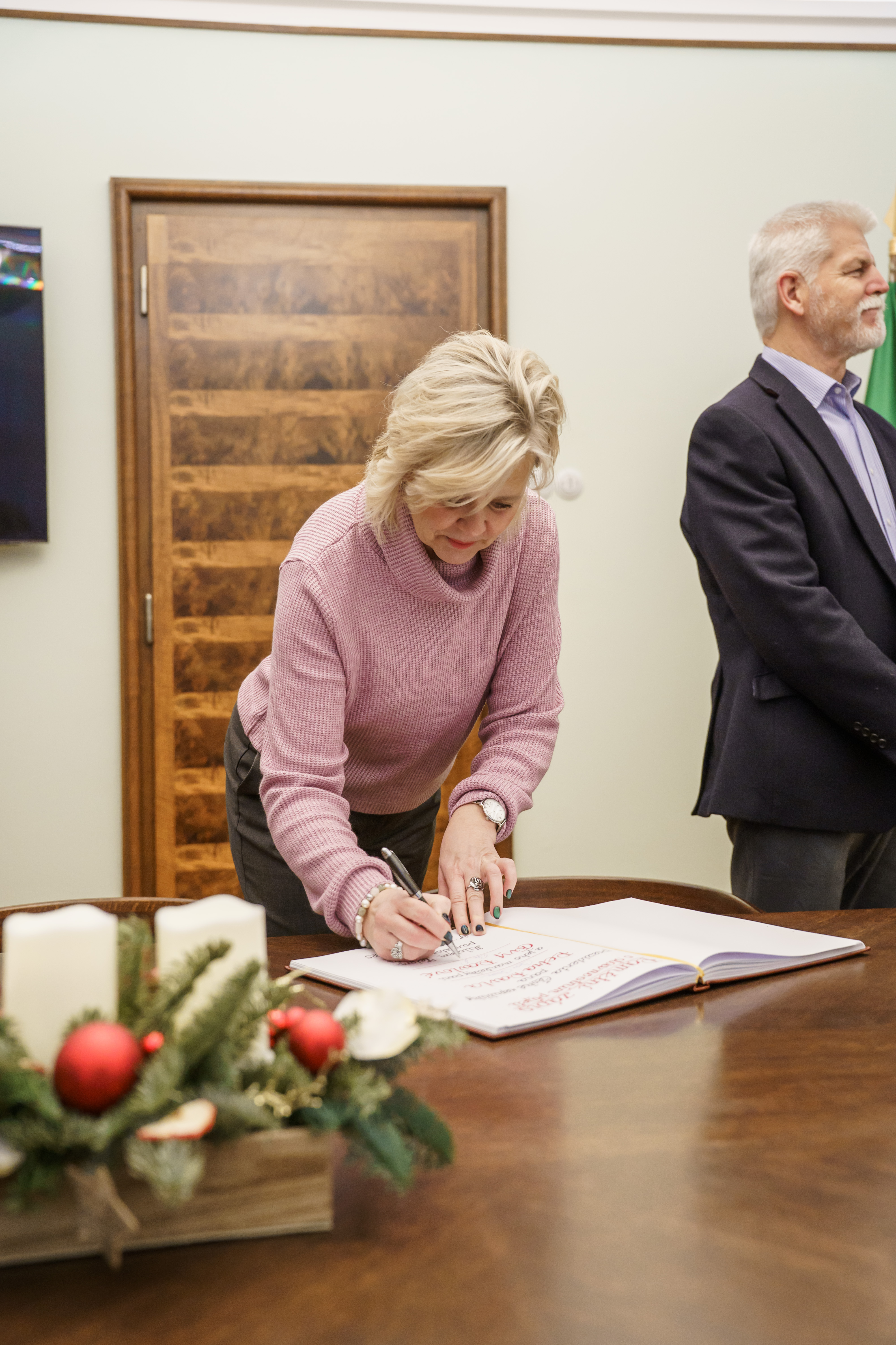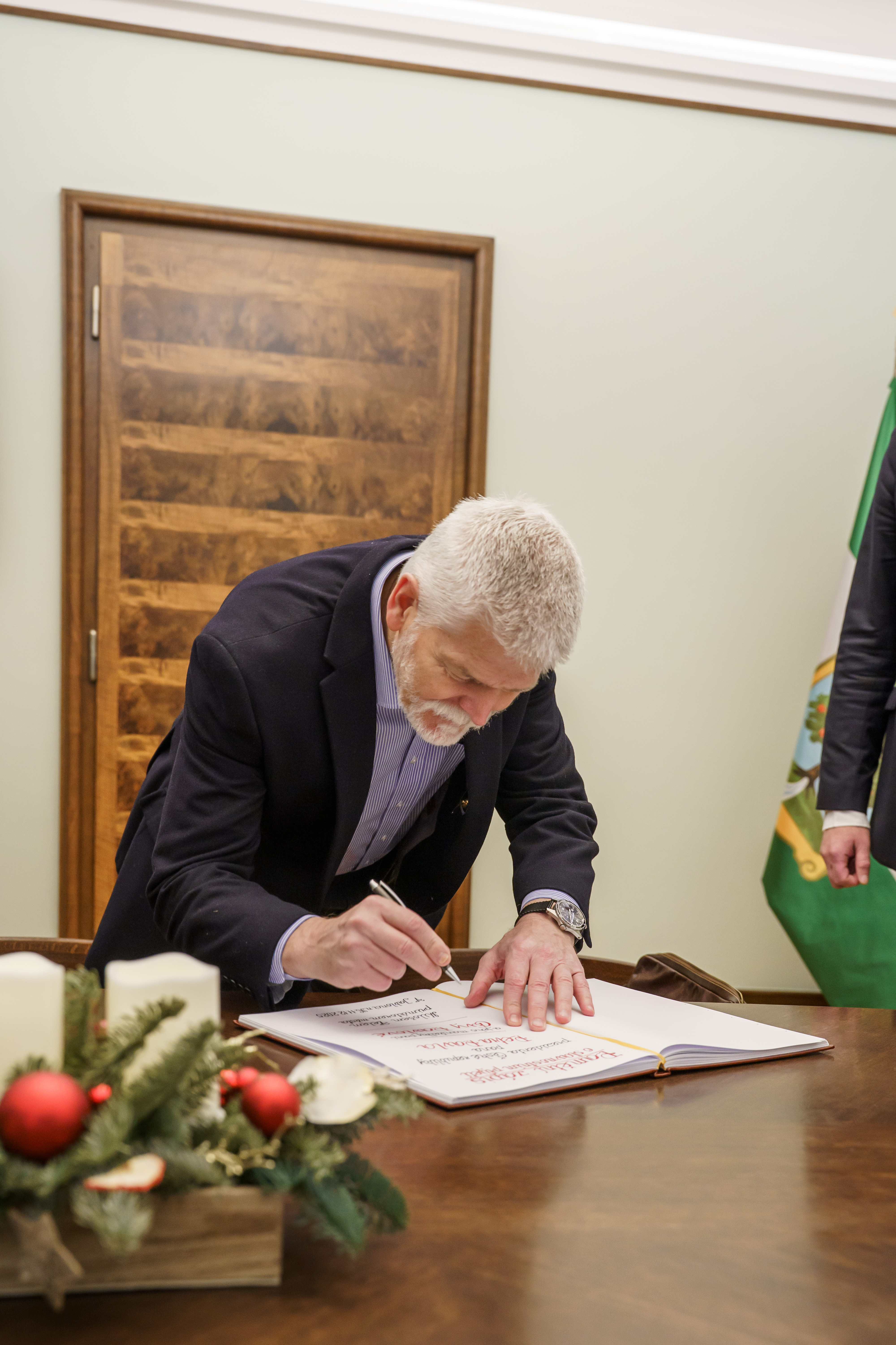 Prezidentský pár se podepsal do pamětní knihy a prohlédl si obnovené zasedací sály, které město zrekonstruovalo do podoby, již navrhl architekt radnice Karl Winter. Citlivé renovace budovy, která je od roku 2023 zapsaná na Seznam národních kulturních památek ČR, hosté velmi ocenili.