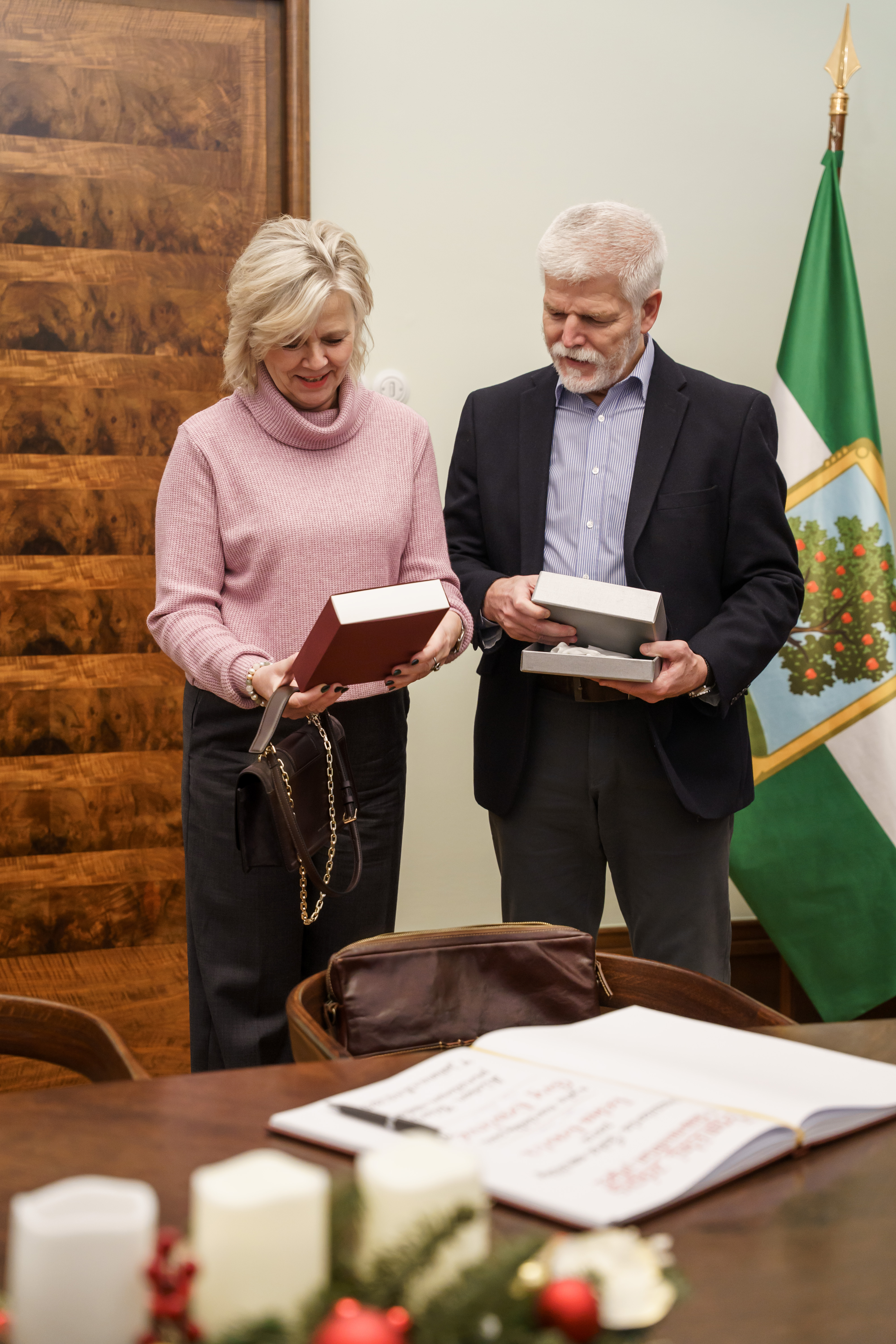 Nejprve návštěva z Pražského hradu zamířila do pracovny primátora. Tam Miloš Vele předal první dámě vánoční filigránské ozdoby od jablonecké firmy Lucid, prezident pak dostal skleněné hodiny od železnobrodské firmy Glasstech, na kterých je motiv z Jabloneckého měsíčníku, tj. horizont Jablonce se třemi věžemi na pozadí Jizerských hor vyrobený technologií 3D vnitřního laseru do skla. Součástí daru byla také kniha o historii jabloneckého hotelu Praha a typická jablonecká jablkovice.